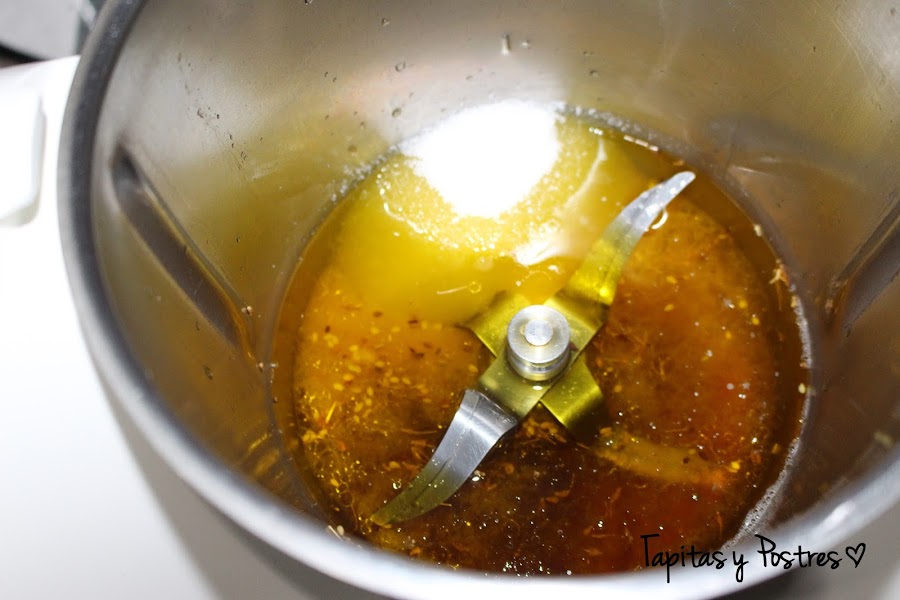 Añadimos la piel de naranja, la matalauva y el ajonjolí y volvemos a calentar 3 minutos, varoma y velocidad 1. Al acabar sacamos la piel de la naranja y la desechamos.