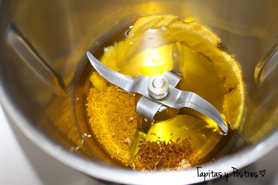 En un cazo calentamos el aceite y cuando esté caliente añadimos la matalauva, el ajonjolí y la cáscara de naranja. Cuando la cascara de naranja empiece a arrugarse, apartamos del fuego el cazo y desechamos la piel de la naranja.