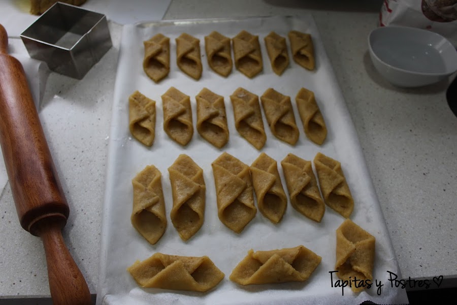 Cortamos cuadrados de masa, yo lo he hecho con un cortapasta cuadrado que tengo, pero si no tenéis cortáis con un cuchillo.