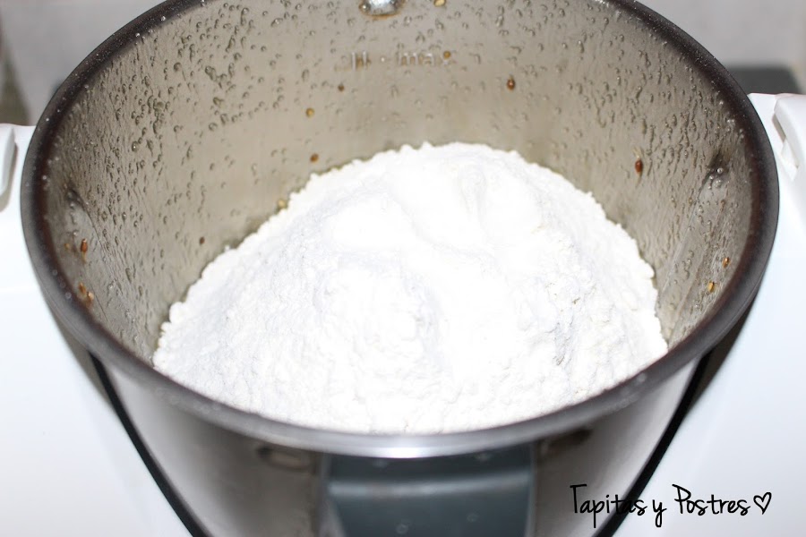 Por último incorporamos las harinas y la sal y mezclamos primero 15 segundos a velocidad 6 y amasamos después 2 minutos a velocidad espiga.