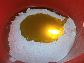 Volcar en un baño la harina en forma de volcán, añadimos el aceite frío pasado por un colador, la sal y el vino manzanilla.