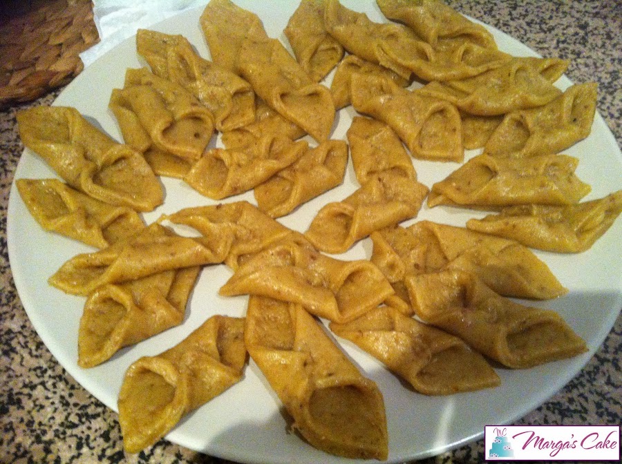 podemos cortar la masa dándole forma redondeada o cuadrada, es cuestión de gustos, yo cuadrados. Para cortarlos podemos ayudarnos de un molde galleta, o con un cuchillo de pizza. Cuando los tengamos cortado iremos uniendo dos puntas opuestas para formar el pestiño y así hasta terminar con toda la masa.