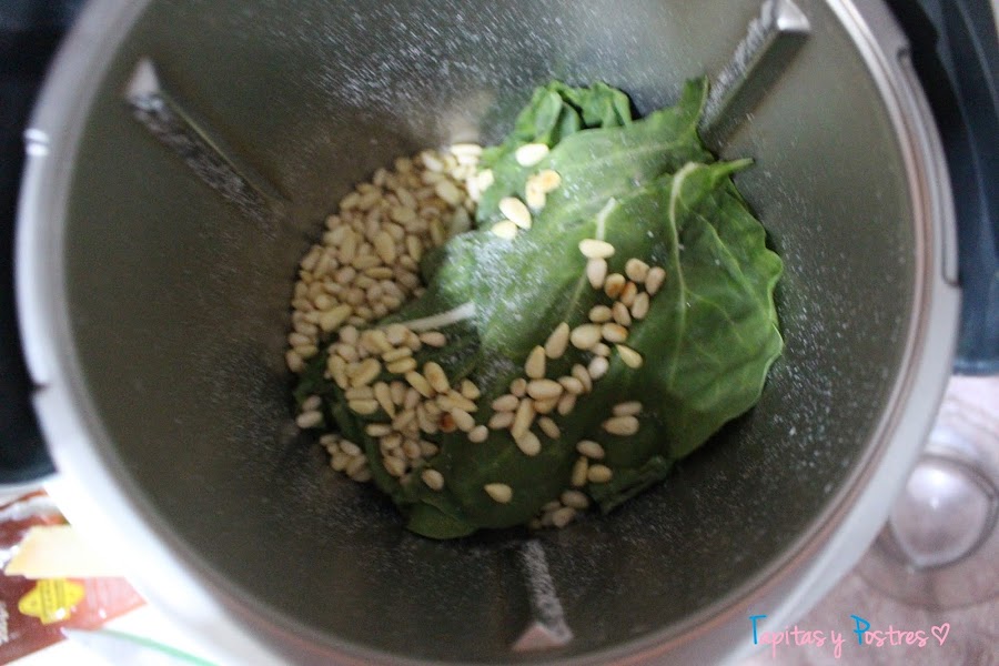 Agregamos los piñones tostados, las hojas de acelgas lavadas y secas, el diente de ajo y la sal. Trituramos 15 segundos a velocidad 6-8.