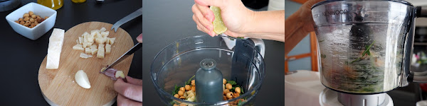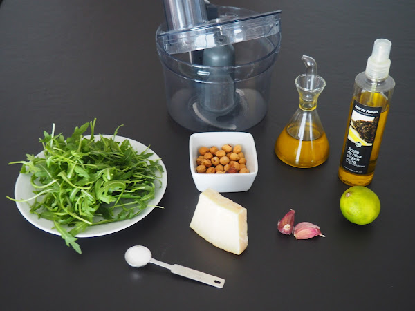 En un procesador de alimentos colocar la rúcula, las avellanas (sin piel), el queso, los ajos, el zumo de lima, un poco de sal (no mucha, el parmesano ya lleva la suya) y la mitad del aceite. Triturar los ingredientes pero sin pasarse, hay que procurar que quede una textura gruesa, con trocitos.