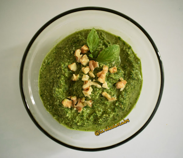 Esta es una variante al pesto tradicional que está preparado con piñones y queso parmesano, pero, esta vez he usado ingredientes que, en mi caso, suelo tener siempre por casa y, además, para que sea apto para todos, he optado por omitir el queso en esta receta. Sin embargo, si no eres vegano o no tienes intolerancia a la lactosa, puedes añadir un poco de queso parmesano rallado para darle mucha más potencia de sabor.