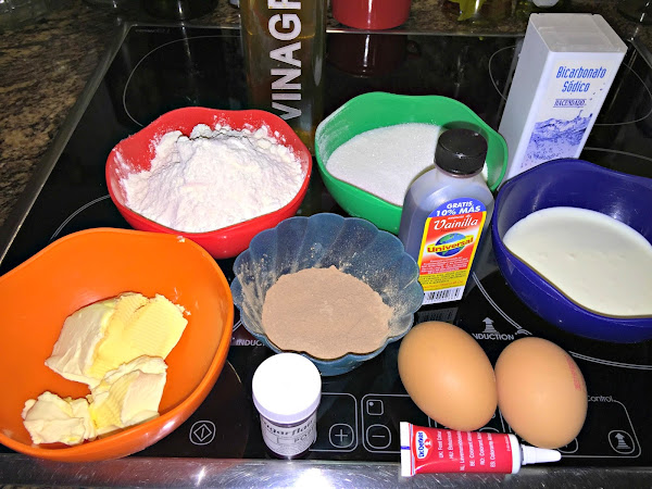 Vamos a comenzar haciendo el bizcocho; calentamos un poco la nata (crema de leche) y le añadimos el vinagre y lo dejamos reposar 10 min.(como un buttermilk). Mientras batimos los huevos con el azúcar hasta que blanqueen. Añadimos una pizca de sal y de bicarbonato y la nata (crema de leche) con el vinagre. Después de batir añadimos una cucharadita de colorante y la mantequilla en pomada. A continuación añadimos la harina, que habremos tamizado junto con el cacao y la levadura. Después de mezclar bien, separaremos la mitad de la masa, una mitad la pondremos en el molde con forma de corazón y la hornearemos a 170ºC durante 30 min. comprobamos con un palillo y si sale limpio, lo sacamos del horno, si no lo dejamos 5 min. más.