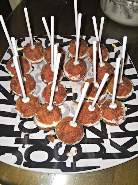 Una vez estén fijos los palos, cubriremos los cake pops con el resto de la crema de queso y los espolvoreamos de migas de bizcocho, al igual que hicimos con el corazón.