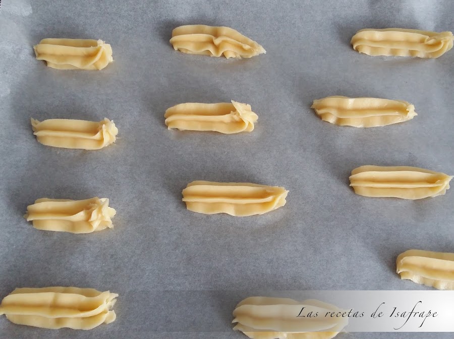 Precalentamos el horno a 200º. Forramos la bandeja del horno con papel de hornear, metemos la masa en una manga pastelera y vamos disponiendo los petisús dejando separación entre ellos porque al hornearse crecen un poco.