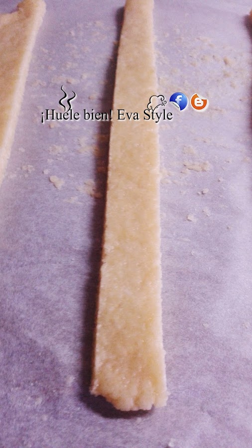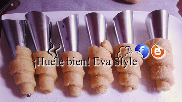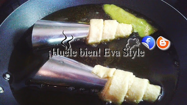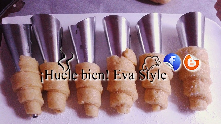 3.- Estiramos la masa con el rodillo sobre una superficie lijeramente enharinada, o sobre papel de horno. La cortamos en tiras finas, las enrollamos en los moldes de cucuruchos.
