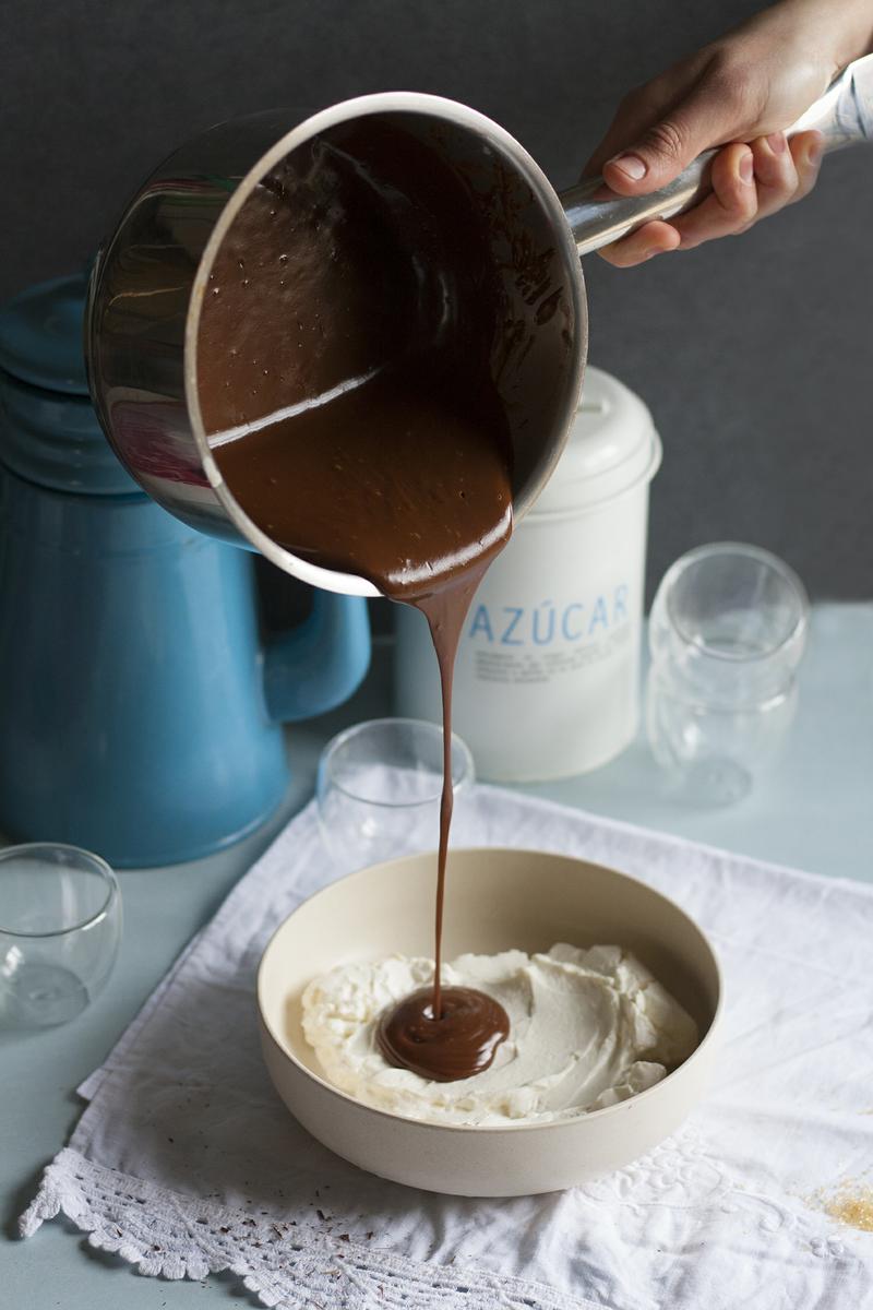 Cuando tengamos el café y el azúcar disuelto en la nata (crema de leche), añadimos el chocolate hasta que se funda totalmente y no tengamos ningún grumito, dejar templar.