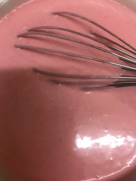 Pon la mezcla de fresas y gelatina sobre el bol en el que está la mezcla de queso, nata (crema de leche) y azúcar y lo mezcla con movimientos envolventes ayudándonos de una espátula de silicona o un batidor de varillas.