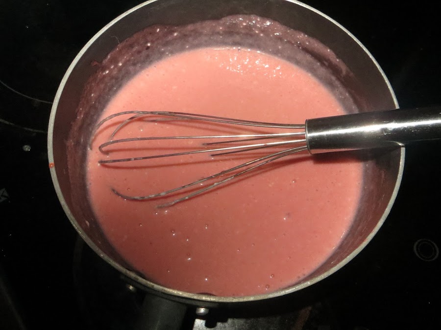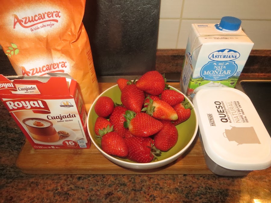 Lavamos muy bien las fresas, le quitamos el péndulo, las troceamos y las echamos al vaso de la batidora para hacer una especie de puré. Las colocamos para dejarlas sin pepitas, reservamos un poco del jugo que es donde vamos a deshacer la cuajada y el resto lo ponemos a calentar.