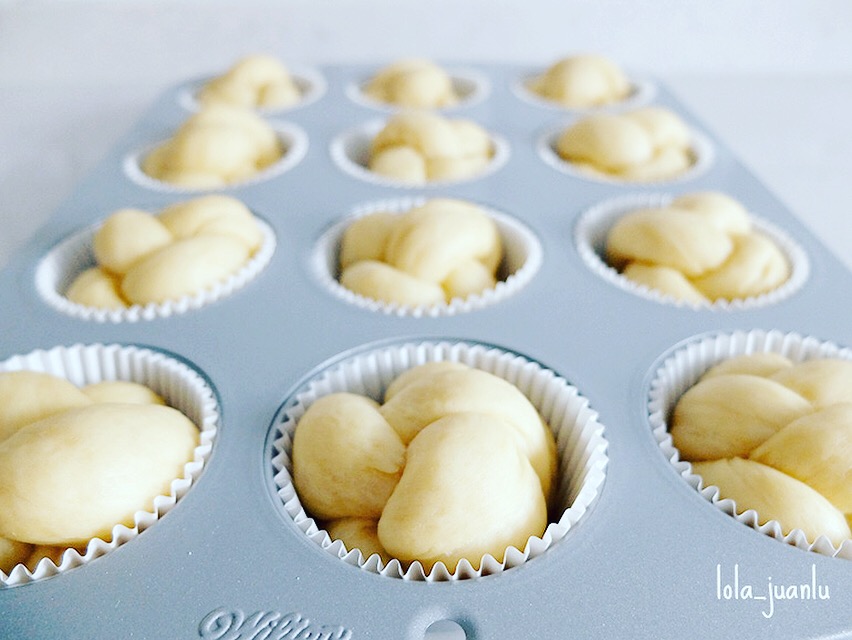 Dividimos la masa en 24 partes iguales. Cada parte la dividimos en tres y formamos tres tiras de masa que trenzamos. Colocamos en una de las cápsulas. Repetimos la operación hasta quedarnos sin masa.