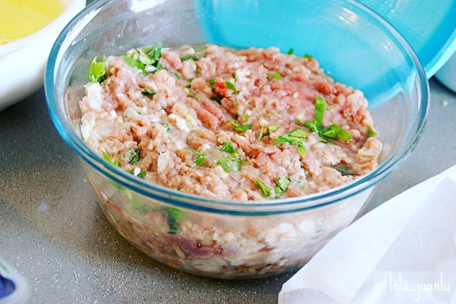 Para ello, cortamos los dos tipos de carne en trozos pequeños y los echamos en un bol. O podemos pedirle a nuestro carnicero que nos la pique.