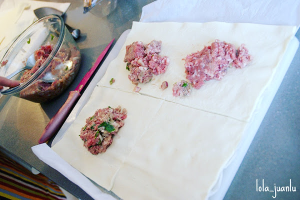 Sacamos la carne del frigorífico, repartimos en los diferentes cuadrados de masa y salamos.