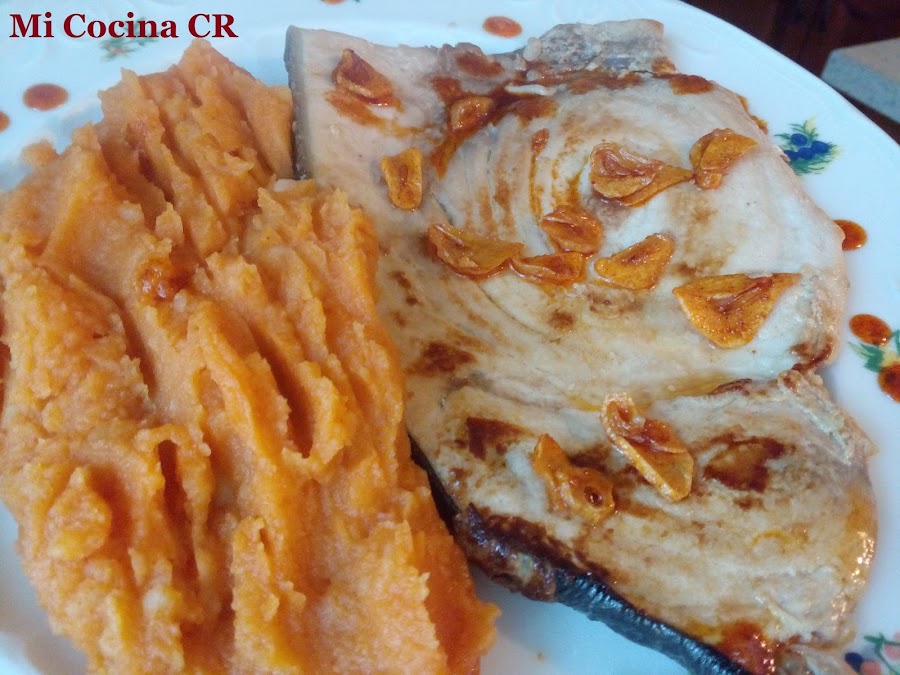 Emplatar la rodaja de pez espada, acompañar con el puré, colocar las laminas de ajo por encima y regar con un poco del aceite con pimentón del pil-pil.