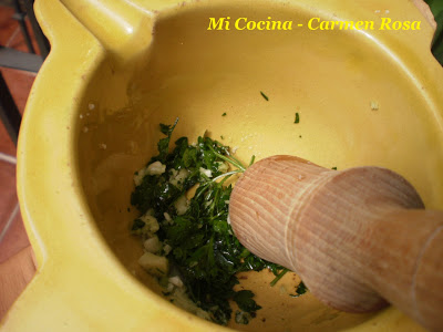 En un mortero echar el perejil, los dos dientes de ajo picaditos y un poco de sal. Machacar bien de forma que queden todos los ingredientes perfectamente mezclados y la masa resultante sea lo más fina posible.