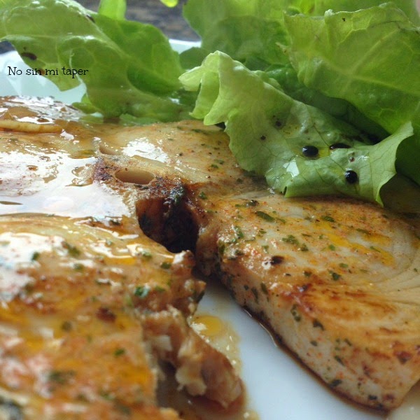 3. Calentamos la plancha o una sartén, con un poquitín de aceite de oliva. Poner las rodajas de pescado sin escurrir del todo en la plancha muy caliente. Dejar que se doren por un lado y dar la vuelta para que se doren del otro (hay que tener precaución para que el pez espada no se nos quede seco).
