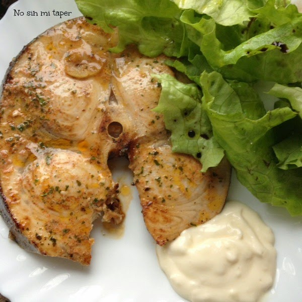 4. Servir acompañado de una ensalada verde, o unas patatas hervidas, al gusto. Yo también le suelo poner una "mayonesa de ajo": esto es, mayonesa de bote mezclada con un diente de ajo picado (yo le pongo dos, porque me rechifla el ajo, a mi marido le repite, pero qué le vamos a hacer, que le ponga menos, digo yo).