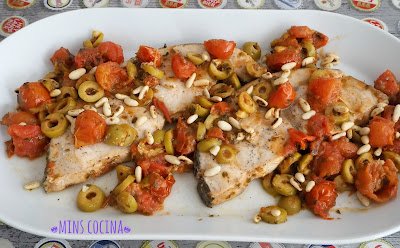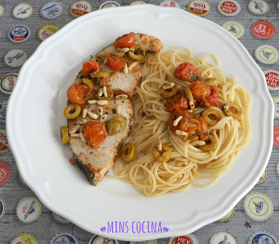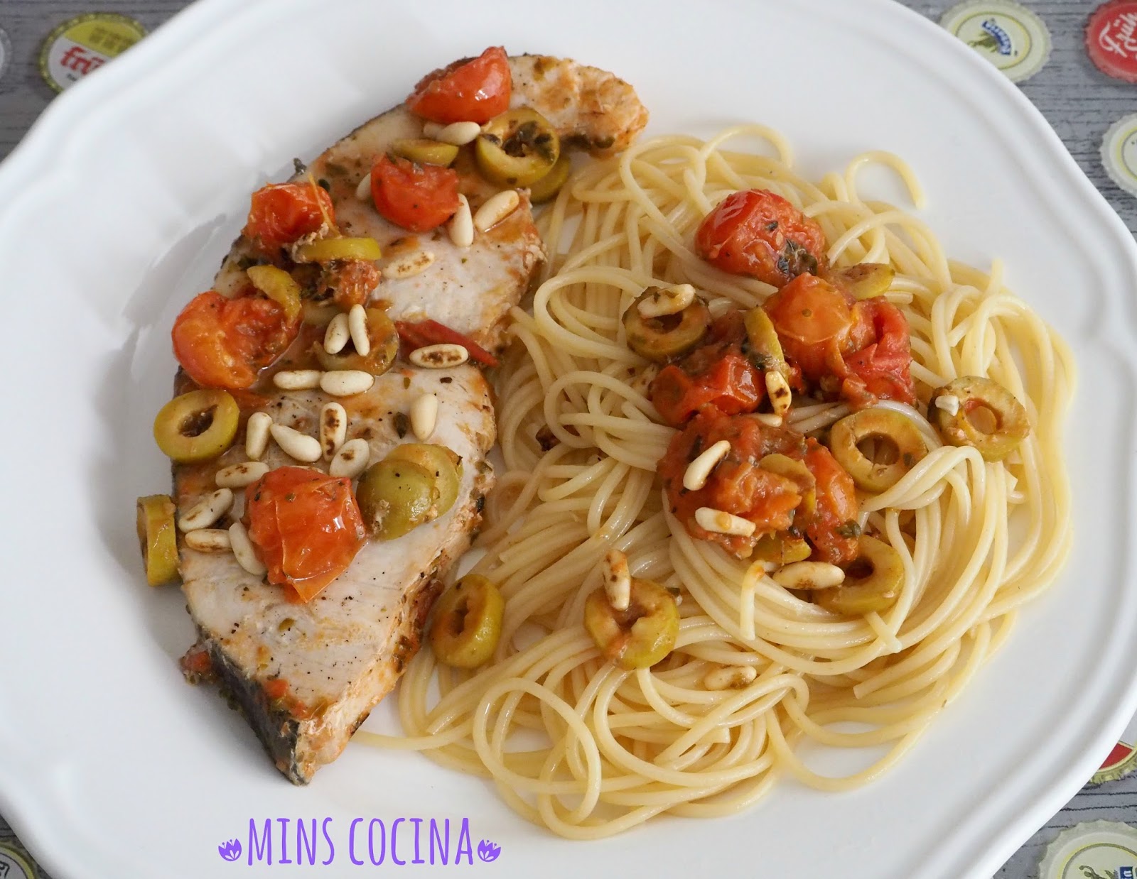 - Retiramos del fuego, añadimos por encima los piñones previamente tostados en una sartén, y servimos inmediatamente. Queda fenomenal acompañado de pasta, spaguetti por ejemplo, pero también de verduras o alguna legumbre. Un plato muy sabroso y colorido que nos transporta a la bella Sicilia sin levantarnos del sillón. Riquísimo!