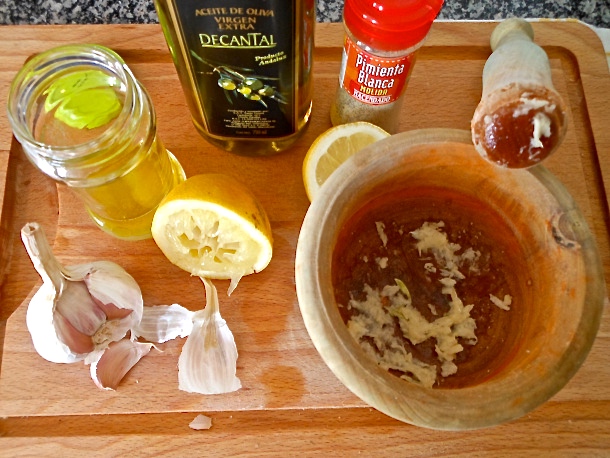 En esta ocasión vamos a comenzar elaborando la vinagreta, para ello pela, coloca el diente de ajo en un mortero y machácalo.