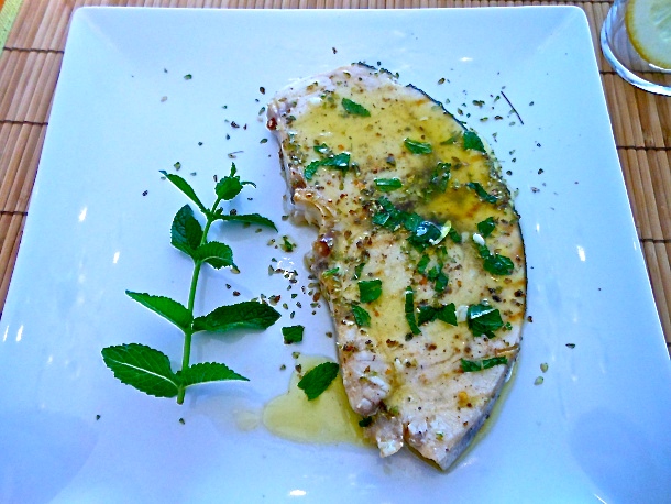 Seguidamente pica la rama de hierbabuena y condimenta ambos filetes de pez espada con ella.