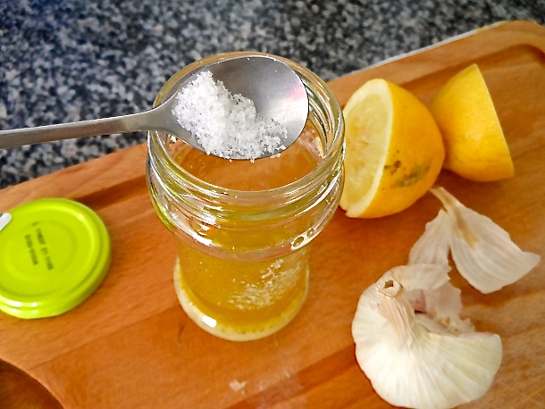 En un bote de cristal vierte las tres cucharadas de aceite de oliva, la cucharada de zumo de limón y la media cucharadita rasa de sal fina.