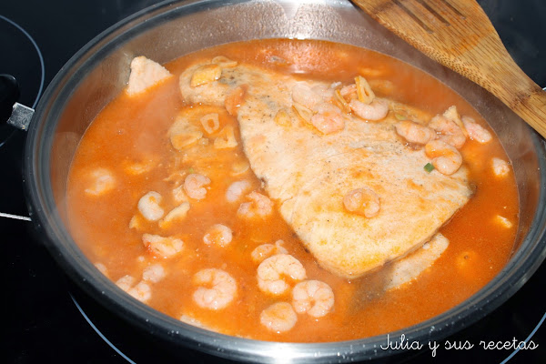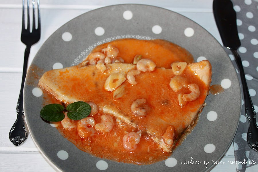 Esta es posiblemente una de las formas mas ricas de comer el pez espada, para mi gusto, aunque se puede comer solamente a la plancha y también está muy bueno, unido a las gambas y con esta salsa se queda mas jugoso y con una textura y sabor mas suave.