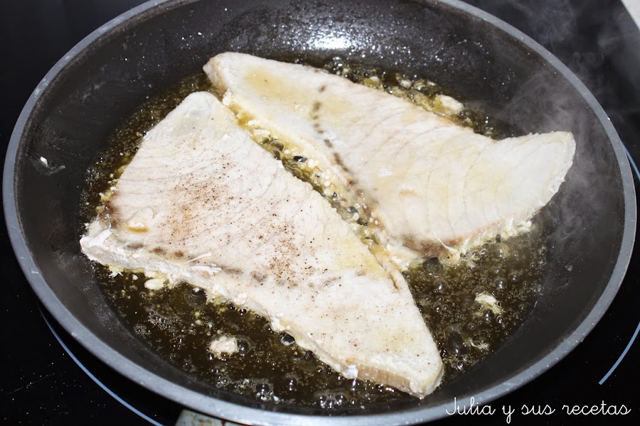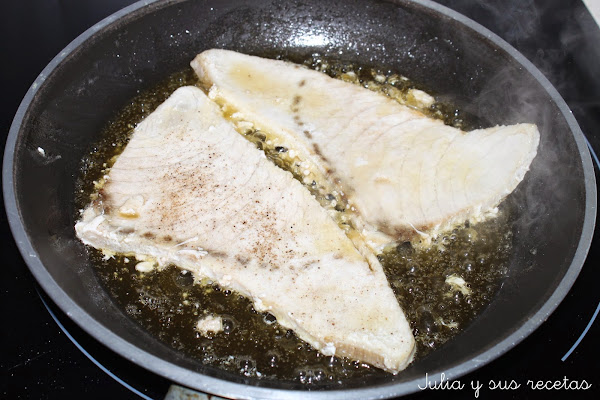 Se les pone sal y pimienta a los filetes y se sofríen en una sarten con un poquito de aceite.