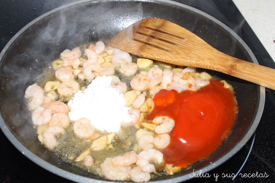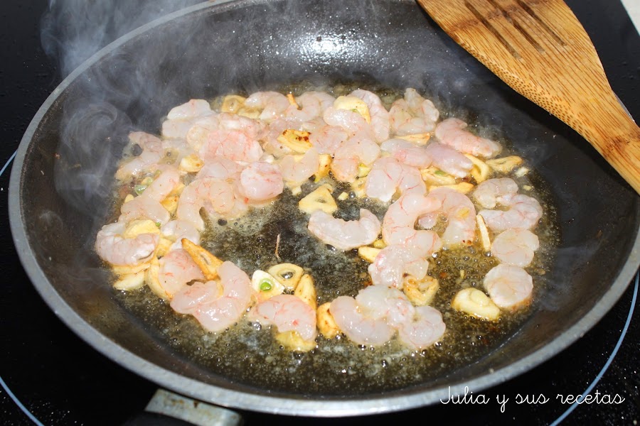 En ese aceite se sofríen los ajos cortados en rodajas, cuando estén dorados se añaden las gambas y se sofríen.