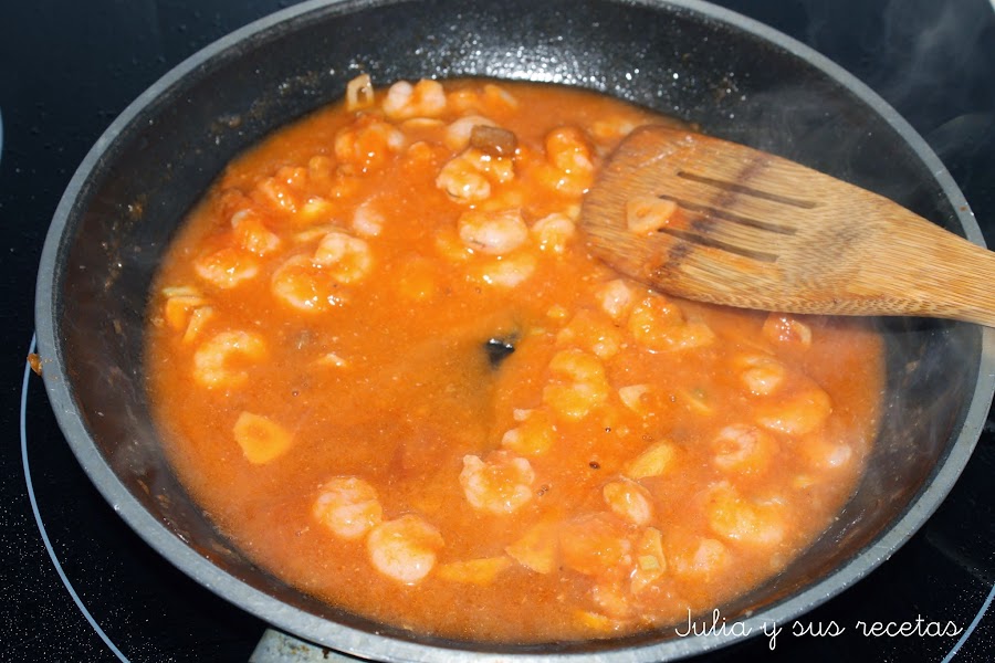 A continuación se añade el vino blanco y el caldo de pescado, se deja hervir un minuto.
