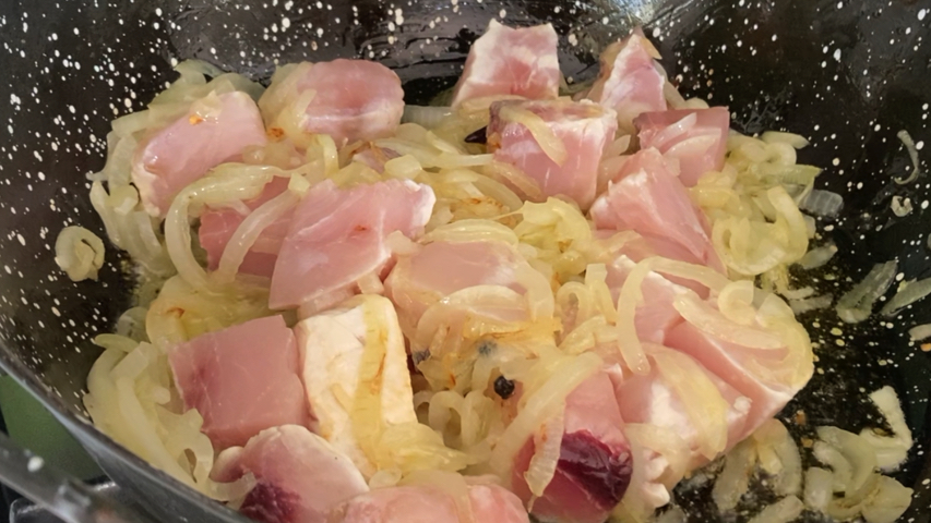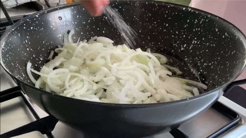 Pon la cebolla en la cazuela, sazona y deja sofreír hasta que esté dorada.