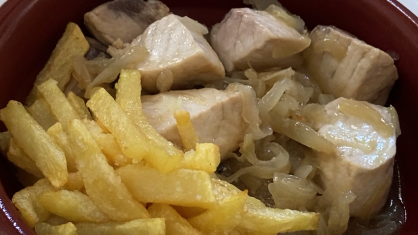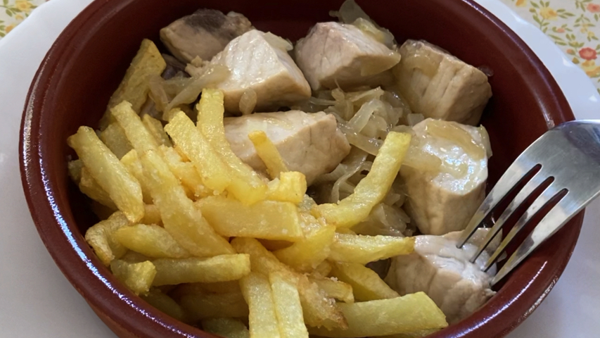 Mientras se hace el pescado pela, corta y fríe las patatas en aceite de oliva hasta que estén bien doradas y crujientes.