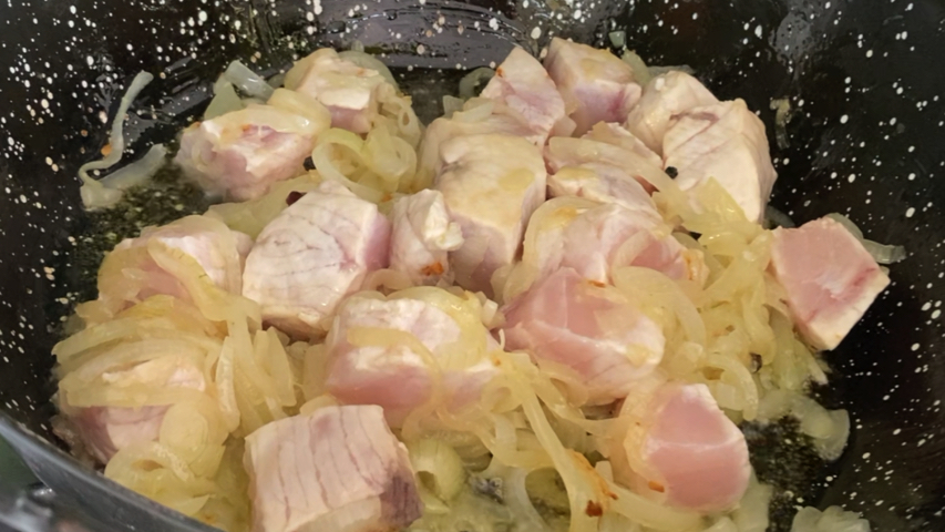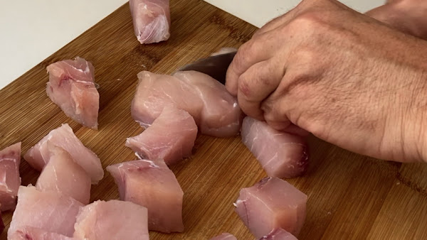 Retira la piel y corta en trozos de trozos de 2 x 2 dedos. Esto también te lo pueden hacer en la pescadería.