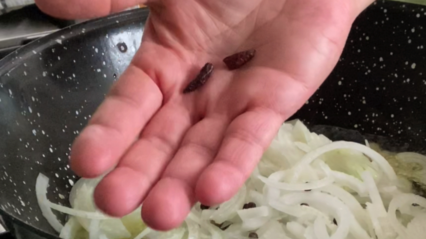 Pon la pimienta y la cayena partida en la cazuela.