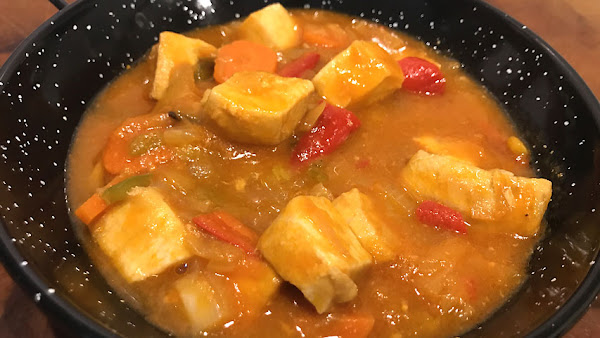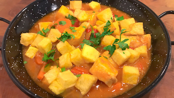 Sirve el estofado de pez espada acompañado de las patatas fritas.