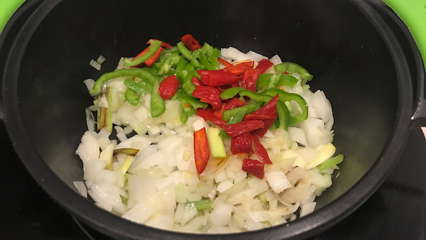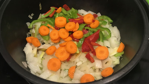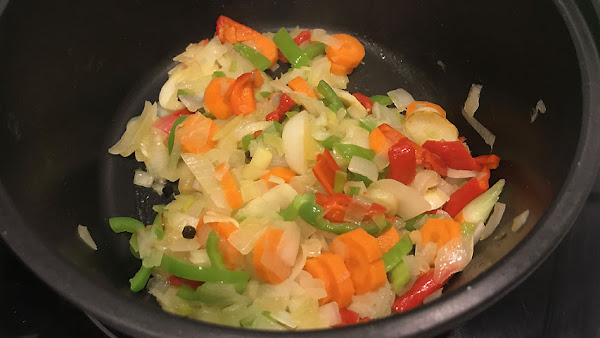 Sofríe los ajos, los ajetes tiernos, la cebolla, los pimientos y las zanahorias.