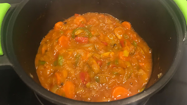 Una vez sofritas las verduras incorpora la salsa de tomate frito.