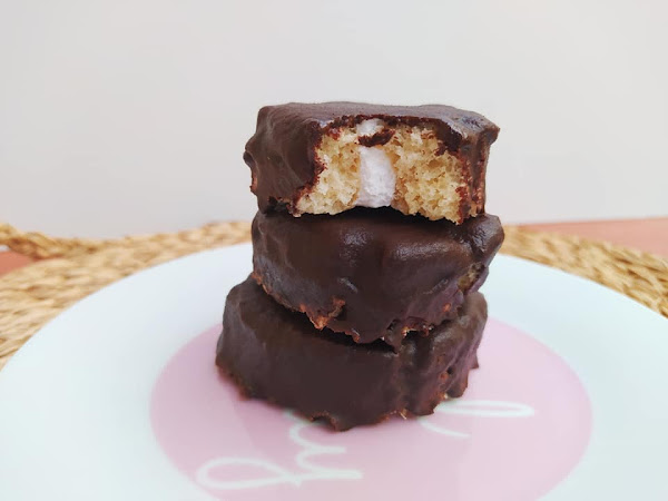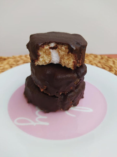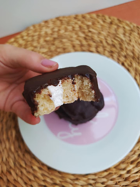 Sacamos el bizcocho enrollado de la nevera y cortamos en rodajas de unos 2cm más o menos, a mi han salido 10 (más los bordes que se han zampado antes de cubrirlos jajaj) ponemos sobre una rejilla y cubrimos con el chocolate derretido.