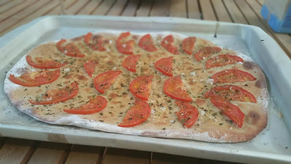 Ponemos la masa estirada sobre una bandeja de hornear, por encima le ponemos un buen chorro de aceite de oliva, colocamos los tomates y espolvoreamos sal en escama y orégano al gusto.
