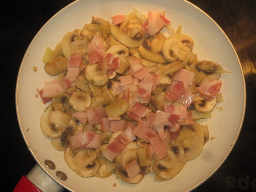 Ponemos en la sartén un poco de aceite y vamos friendo los dientes de ajo pelados y bien picaditos con la cebolla cortada en juliana. Una vez que empieza a estar transparente añadimos los champiñones y cuando estén un poco cocinado el bacon para que se hagan todos los ingredientes y se mezclen los sabores. Sacamos y reservamos.