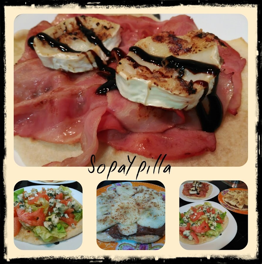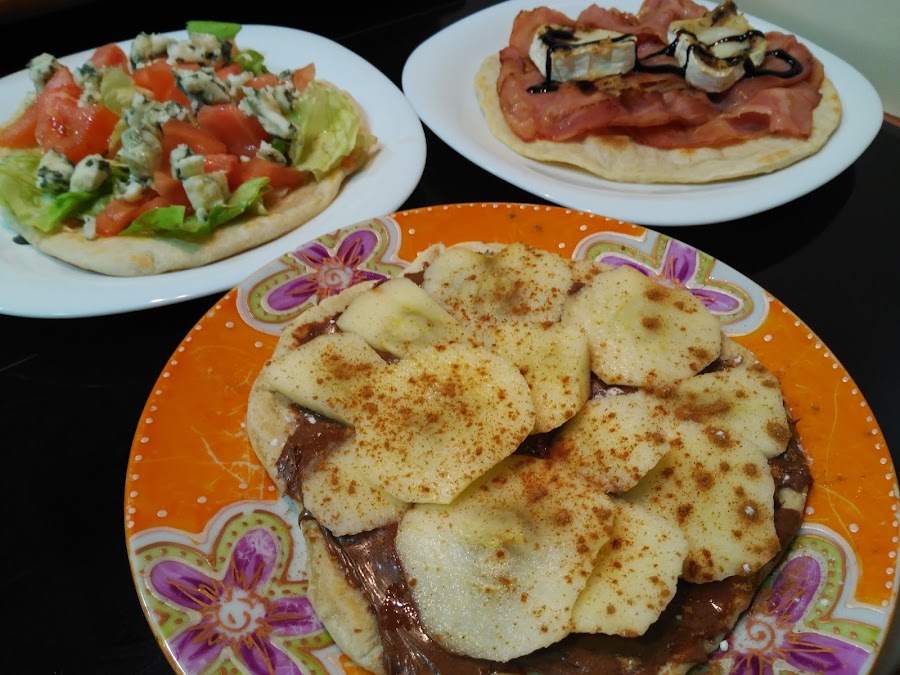 UUUUHHHHH que descubrimiento!! Las piadinas son una base de pan tipo torta, para rellenar con lo que queramos...yo las hice de bacon y queso de cabra a la plancha, otra fría de lechuga, tomate y queso roquefort y una dulcita con crema de chocolate y manzana laminada y canela...ummmm deliciusssss...os dejo la receta de las piadinas y aleee a echarle imaginación!!