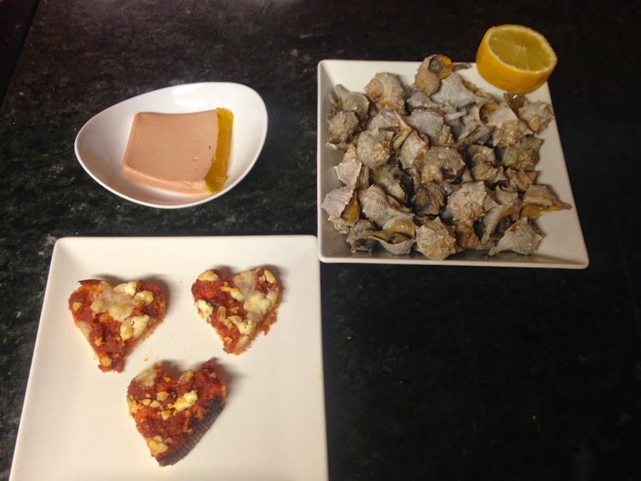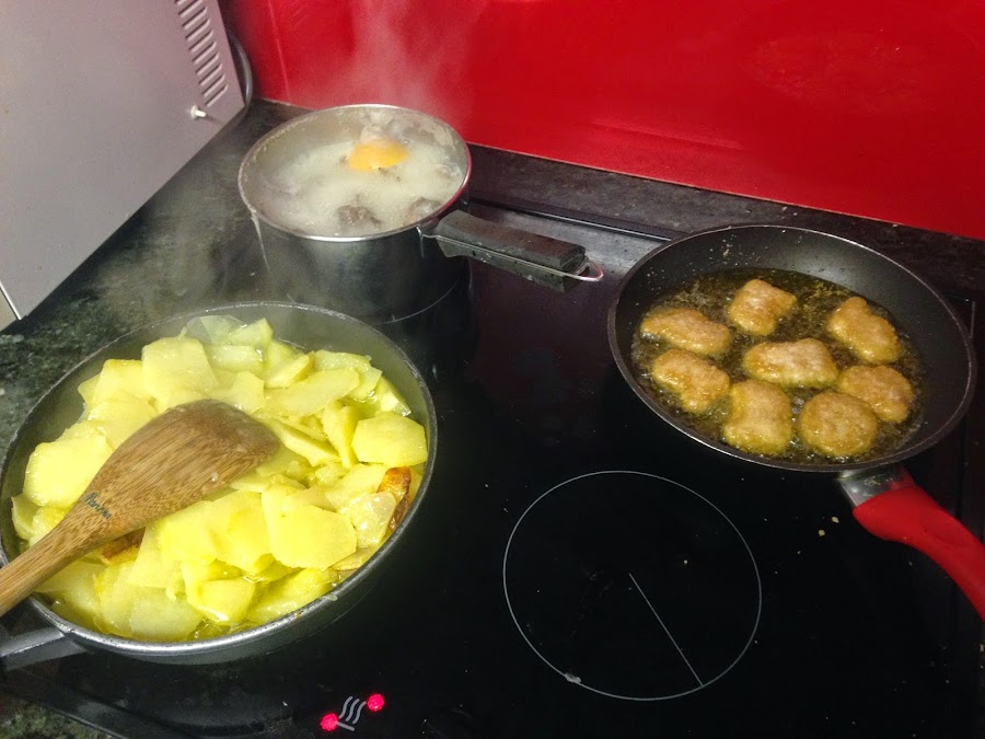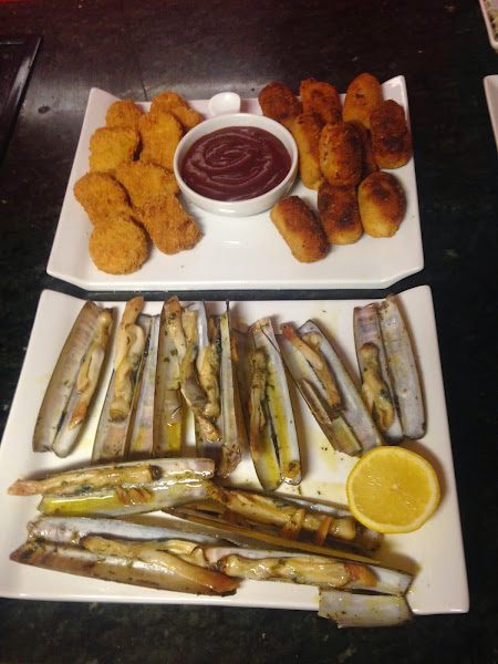 Elaboración de la tortilla, caracoles de mar y los nuggets.