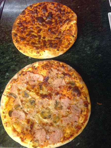 Pizza 4 quesos y pizza de pavo con champiñones.