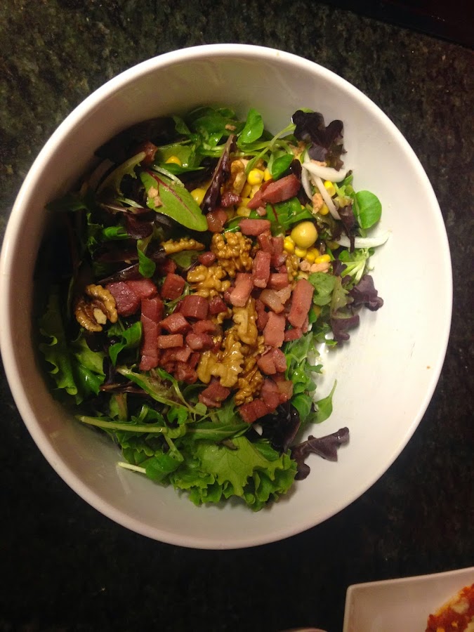 Ensalada de temporada con frutos secos y jamón.