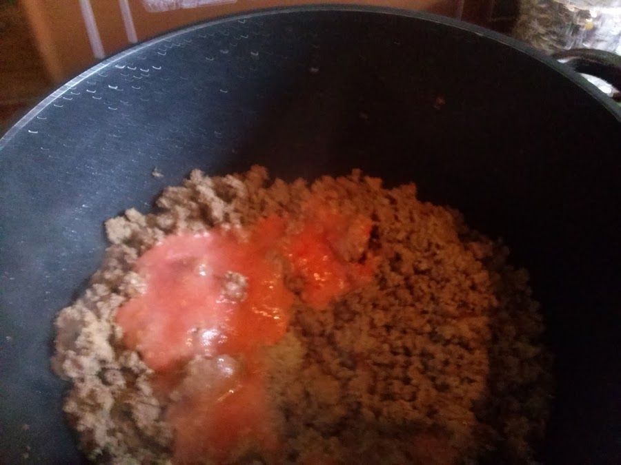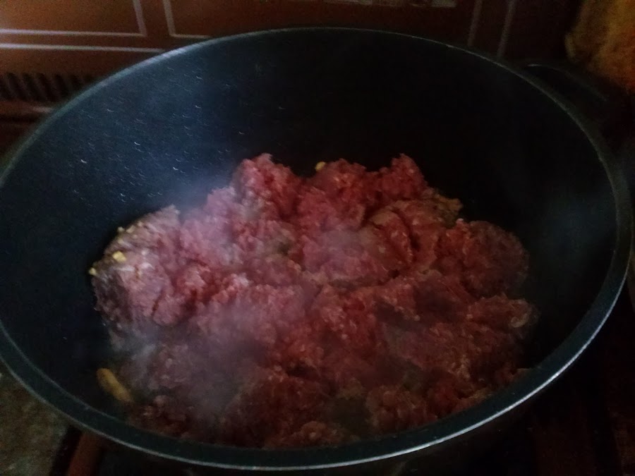 Se agrega la carne molida, la cebolla en polvo, el ajo en polvo,el cuadrito de consomate y el cuadrito de costilla cargada, se tapa para que se cuesa y suelte su jugo se deja por unos 15 a 20 minutos y seguimos observando la carne para cuando se seca un poco y se empiece a freír ligeramente