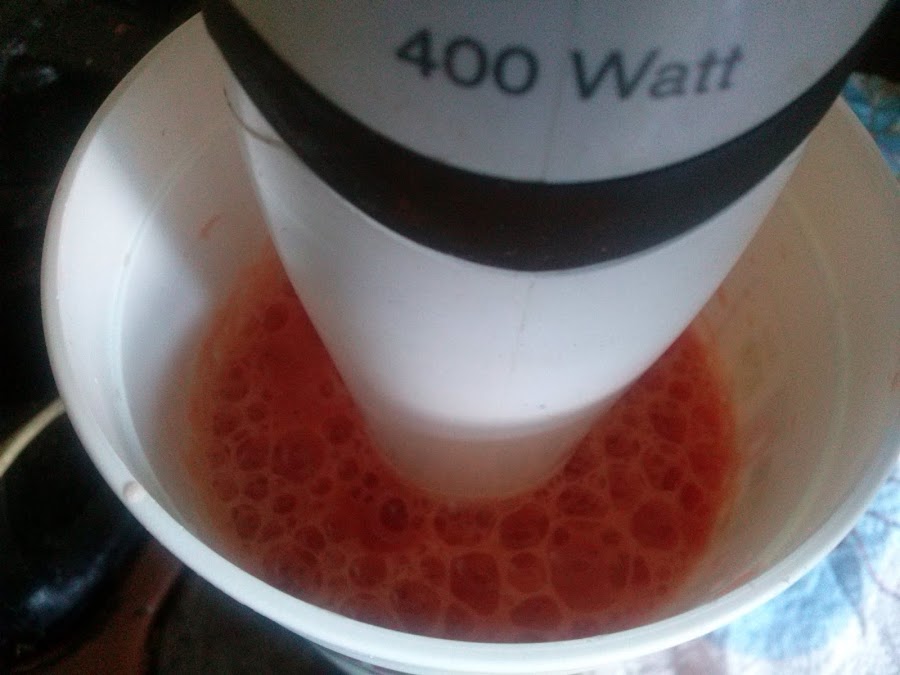 Mientras que pasa lo anterior en un cuenco o vaso profundo tomamos los tomates y licuamos bien para no tener que colar y no agregamos agua
