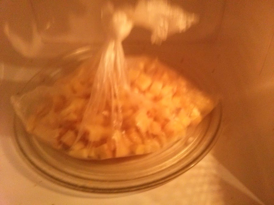 Colocamos las papas en una bolsa plástica se saca todo el aire de la bolsa, cerramos con un nudo sin apretar y ponemos en el microondas por 6 minutos