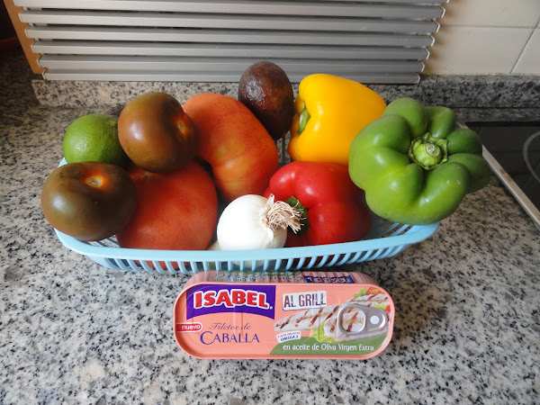 Hoy os traigo este picadillo de tomate y pimiento, con alguna cosita más y con la caballa ISABEL al grill que incluye la caja DISFRUTABOX de este mes.
