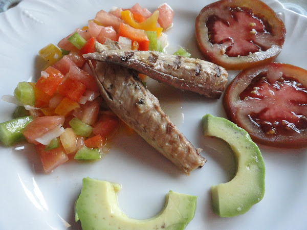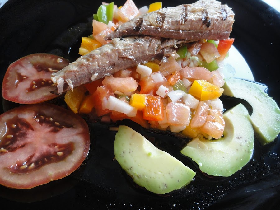 Pelamos los tomates, quitamos las pepitas y cortamos en brunoise. Con un pelador, si podéis quitar la piel de los pimientos, quedan más agradables de comer, cortamos igualmente en brunoise. Tambien cortamos la cebolla. Preparamos la vinagreta y aliñamos. Como idea de presentación se me ocurre poner un poco de aguacate y de tomate cumato que le den todavía más color al plato. Colocamos encima los trozos de caballa. Lo tomamos bien fresquito.